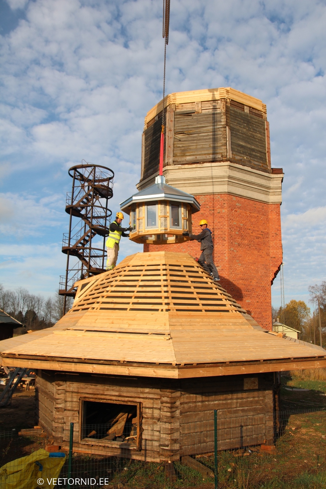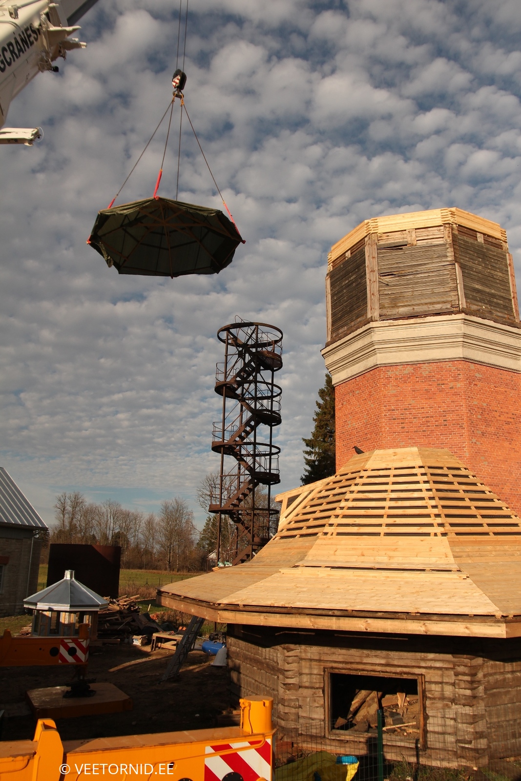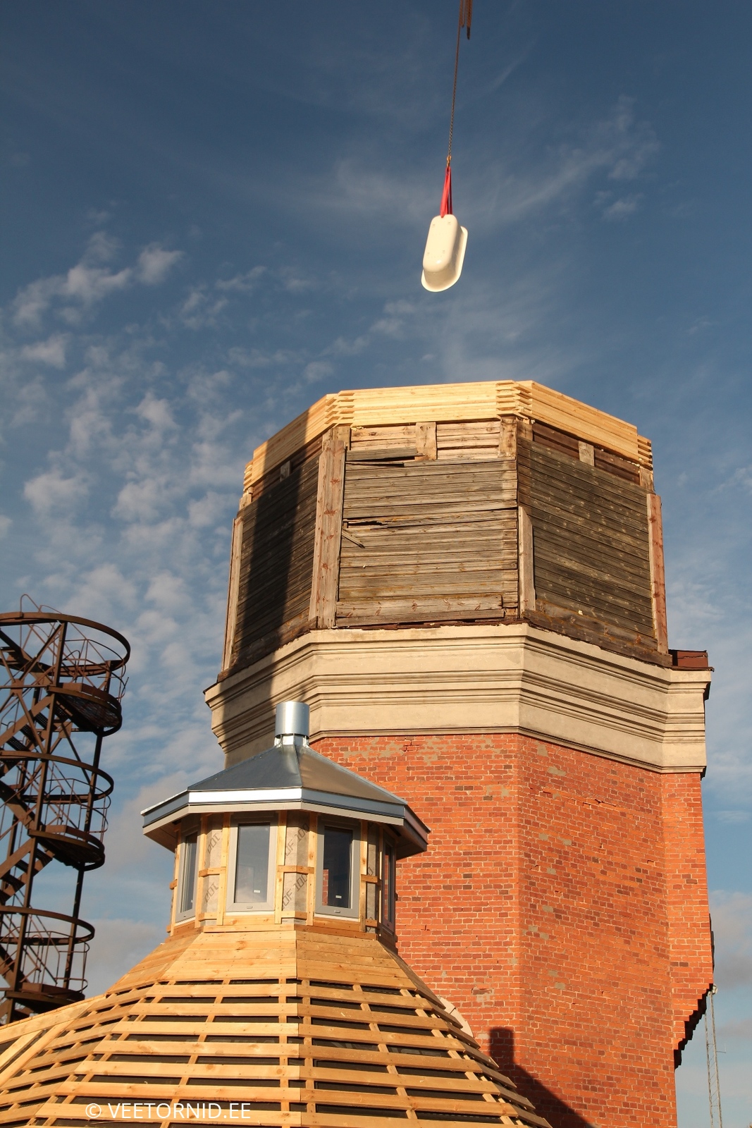 Kuna seekord polnud isegi 130-tonnist kraanat käepärast, ujus kohale 200-tonnine - üle munakivisillutise oma kümnel hiiglaslikul rattal. Koos kõigi saatjamasinate, vasturaskuste ja tugiplaatidega. Sättis ennast tund aega paika, aga edasi sujus loodetu juba vuhinal. Kõigepealt kadus murumüts 40-meetrise noole abil vanale paagile katuseks. Siis liikus 8 aknaga nippel katuse tippu. Edasi kerkis vann neljanda korruse põrandale. Kraanajuhile valmistas muidugi nalja 200-tonnise masinaga vanni tõsta, kuid treppe mööda seda malmist kolakat sinna ei lohistaks. Järgnevalt kontrollisid väga tõsised asjatundjad hoolega kettide ja troppide kinnitust kiivri küljes. Alla tõstes kaalus too monstrum 15,5 tonni. Maapinnal sai seljast kooritud paks vooder, kaunistused, üks massiivne ja tarbetu vahelagi ning ca 10m3 tuvipaska. Upitamisel näitas kraana uuenenud tornitipu kaaluks 9,8t. Seega üle viie tonni jäi maapinnale. Mis prügiks, mis renoveerimisse. 60cm võrra tõstetud seinte peale klappis kiiver pärast väikest sobitamist ideaalselt. Sain enneolematust kõrgusest kaeda ümbruskonda kuni Nissi kirikuni. VÕIMAS. Ei teagi kohe, mitu korda selle päeva jooksul naeratasin. Eriti tagasiteel ja kodus pilte / videosid sorteerides veel ja veel ja veel. ÄGÄ