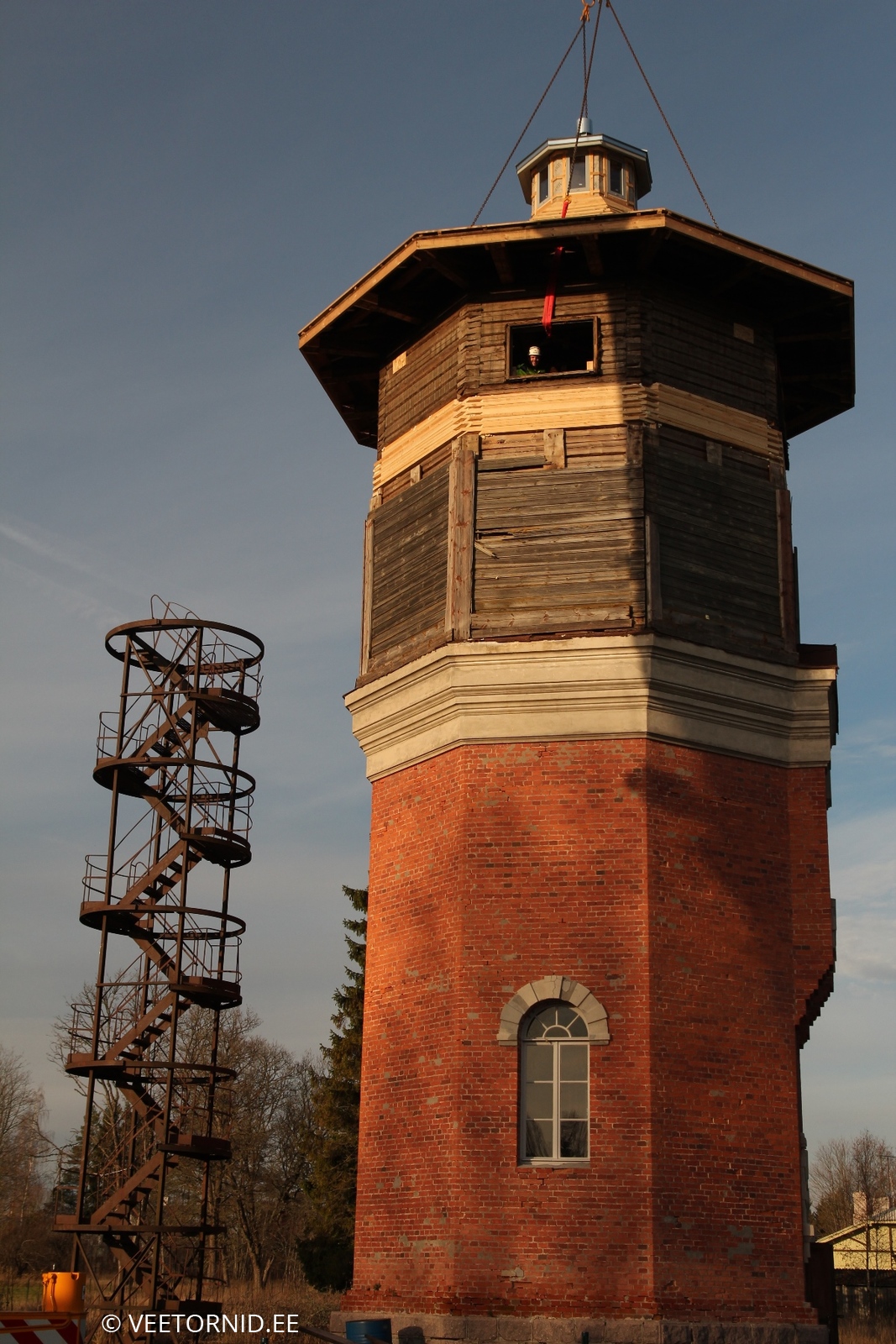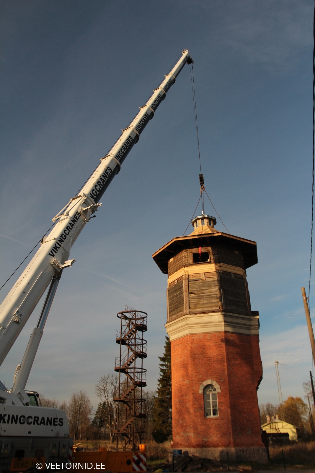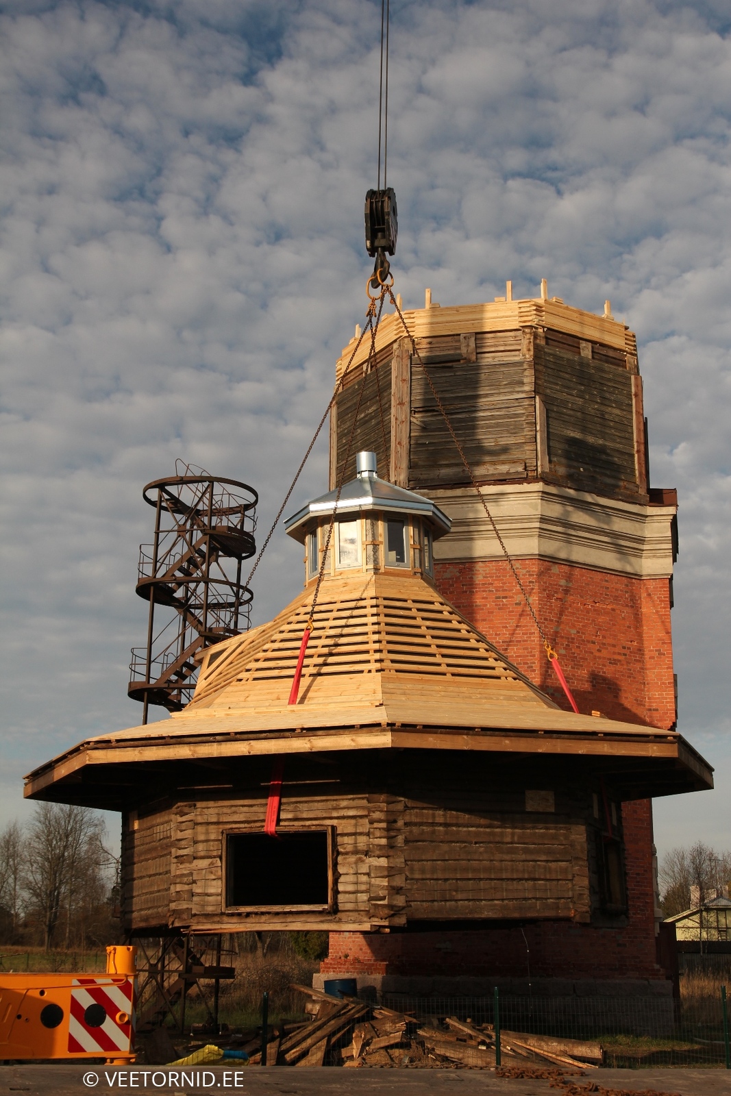 Kuna seekord polnud isegi 130-tonnist kraanat käepärast, ujus kohale 200-tonnine - üle munakivisillutise oma kümnel hiiglaslikul rattal. Koos kõigi saatjamasinate, vasturaskuste ja tugiplaatidega. Sättis ennast tund aega paika, aga edasi sujus loodetu juba vuhinal. Kõigepealt kadus murumüts 40-meetrise noole abil vanale paagile katuseks. Siis liikus 8 aknaga nippel katuse tippu. Edasi kerkis vann neljanda korruse põrandale. Kraanajuhile valmistas muidugi nalja 200-tonnise masinaga vanni tõsta, kuid treppe mööda seda malmist kolakat sinna ei lohistaks. Järgnevalt kontrollisid väga tõsised asjatundjad hoolega kettide ja troppide kinnitust kiivri küljes. Alla tõstes kaalus too monstrum 15,5 tonni. Maapinnal sai seljast kooritud paks vooder, kaunistused, üks massiivne ja tarbetu vahelagi ning ca 10m3 tuvipaska. Upitamisel näitas kraana uuenenud tornitipu kaaluks 9,8t. Seega üle viie tonni jäi maapinnale. Mis prügiks, mis renoveerimisse. 60cm võrra tõstetud seinte peale klappis kiiver pärast väikest sobitamist ideaalselt. Sain enneolematust kõrgusest kaeda ümbruskonda kuni Nissi kirikuni. VÕIMAS. Ei teagi kohe, mitu korda selle päeva jooksul naeratasin. Eriti tagasiteel ja kodus pilte / videosid sorteerides veel ja veel ja veel. ÄGÄ